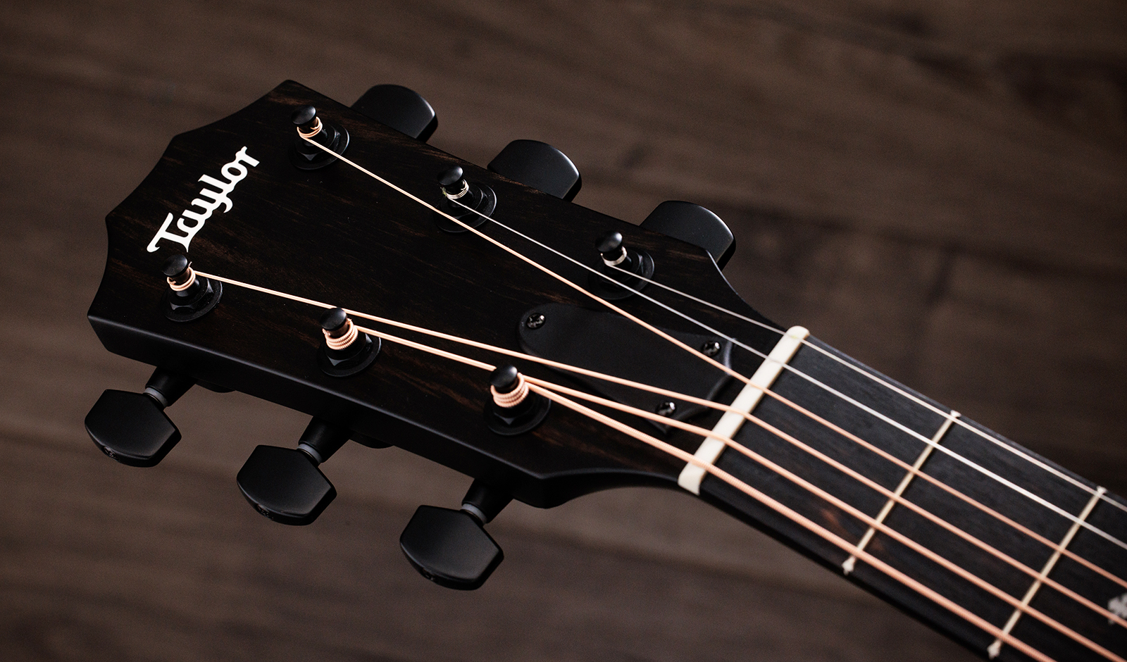 With the accommodating contours of the Grand Auditorium body, the slender Taylor neck profile and comfortable 1-11/16” nut width, players can expect a smooth feel with low action and easy fretting up the neck. Other appointments include a gloss-finish body with either white binding (trans blue and grey models) or black (trans red), Small Diamond fretboard inlays in Italian acrylic with a matching single-ring rosette, a black pickguard and satin black tuning machines.
